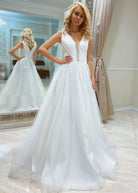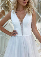 A Line Bohemian Long Tulle Simple Wedding Dress V Neck
