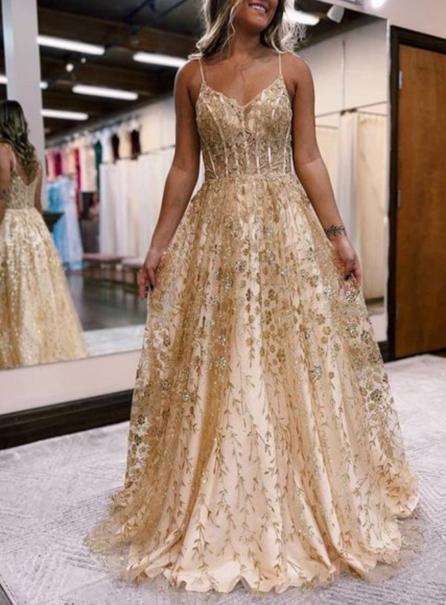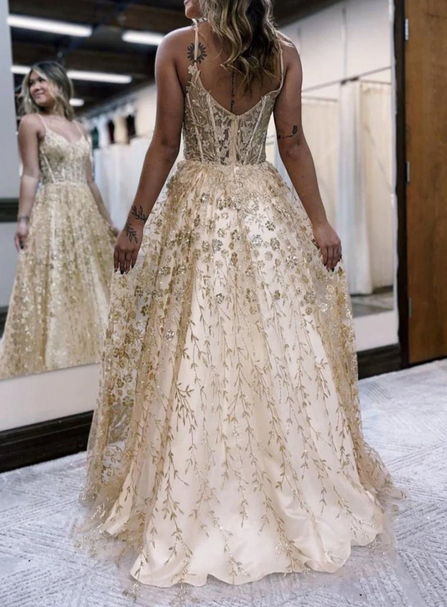 The A-Line silhouette and spaghetti straps of this exquisite prom dress from KissProm create a beautifully balanced look that flatters any figure. Featuring intricate appliques and a flattering corset design. Available in enchanting lilac and luxurious gold, you're sure to captivate everyone's attention at your prom or any special occasion. These delicate details, combined with the luxurious fabric, create a visually stunning piece that will have you feeling like royalty on your prom night. Pick it as your evening dress, with its intricate design and timeless appeal. For formal dresses, the luxurious fabric and graceful silhouette ensure you stand out in style at any sophisticated event.
