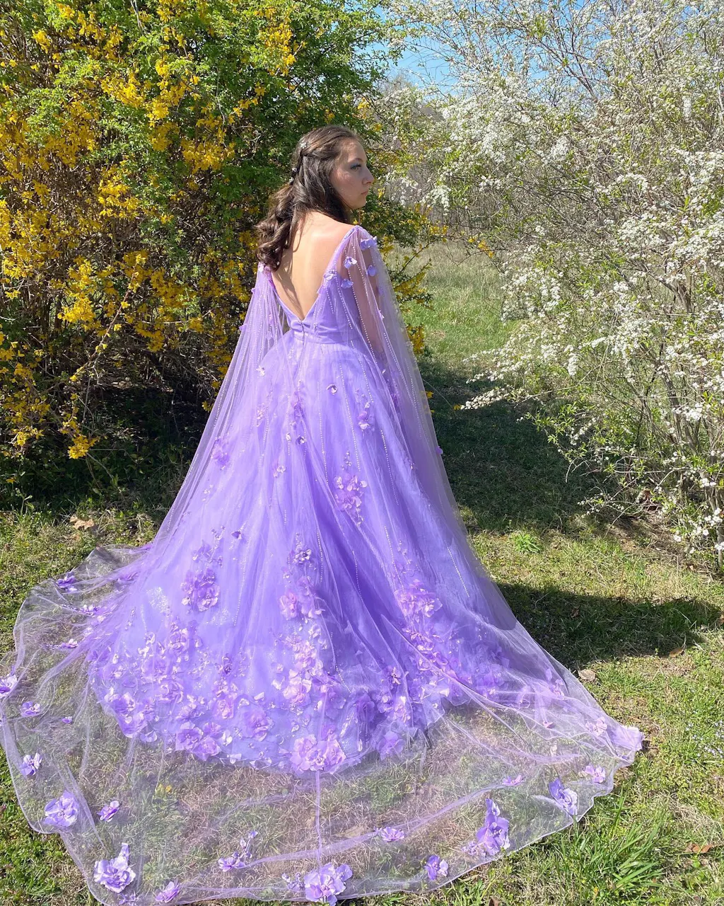 Looking for a stunning prom dress Check out KissProm! This charming purple dress is made of high-quality, shimmering lace with delicate 3D flowers, which is a perfect choice for any formal event. An ideal choice for evening dresses, with its V-neck and cape sleeves flatter your curves, and the A-line silhouette suits various body types. Make a statement at prom or any formal event with KissProm's beautiful dress.