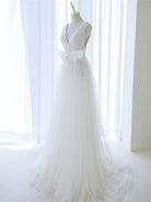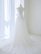 A-Line V Neck White Tulle Long Wedding Dress with Bow