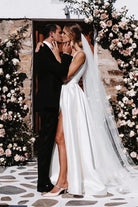 This elegant A-line bridal gown crafted from luxurious white satin fabric offers a timeless silhouette with a modern twist. Featuring a flattering V-neckline and sleeveless design, it beautifully frames the upper body while maintaining a sleek and sophisticated look. The gown flows into a graceful sweep train, adding subtle drama to your walk down the aisle. A daring backless detail enhances the gown’s allure, complemented by delicate pleats that add texture and movement. A tasteful split at the front brings a contemporary edge, making this bridal gown perfect for the bride who desires classic elegance with a hint of boldness.