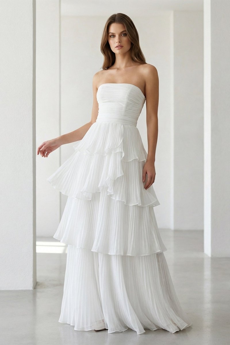 Introducing our stunning A-Line bridal gown, a perfect blend of elegance and modern design. Crafted from luxurious chiffon fabric, this gown is available in classic colors such as White, Black, Champagne, and Ivory. The sweep train adds a touch of drama as you glide down the aisle. Featuring a strapless neckline that beautifully frames your shoulders, this sleeveless bridal gown enhances your natural beauty while providing freedom of movement. The zipper back ensures a secure fit and easy wear. Embellished with exquisite ruffles that cascade gracefully throughout the gown, this design captures both whimsy and sophistication. Whether you're planning an intimate gathering or a grand celebration, this A-Line bridal gown will make you feel like the epitome of elegance on your special day.