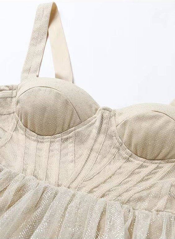 Grace any room with the radiant elegance of the Makayla Homecoming Dress. Crafted for those who seek a touch of magic, this A-line silhouette dress drapes effortlessly, flattering every curve. The sparkling tulle fabric dances with every step you take, shimmering under the lights in a mesmerizing champagne hue. The timeless sweetheart neckline accentuates the décolletage while shoulder straps offer both support and a hint of allure. The dress's pièce de résistance, however, is the illusion corset bodice, intricately designed to command attention and draw admiration. Choose the Makayla dress, and you're not just choosing a garment - you're embracing a night to remember.
