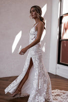 Elegant Mermaid V Neck Lace Boho Wedding Dresses with Slit