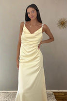 Evale | Yellow - Sheath Spaghetti Straps Satin Long Prom Dresses With Pearls