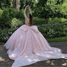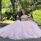 This enchanting ball gown is crafted from delicate lace fabric. The sweetheart neckline and sleeveless design add elegance. Complete with a graceful lace-up back, this dress is perfect for making a grand entrance at your quinceanera, blending romance and sophistication effortlessly.