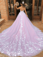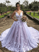 Step into your fairytale with the Melania wedding dress. This A-Line dress is crafted from delicate tulle in a romantic light purple hue that exudes an ethereal charm. The V-neckline beautifully frames the decolletage, while the button-back adds a classic touch. The appliqued embellishments further enhance the gown, making this dress a perfect blend of elegance and modern romance.