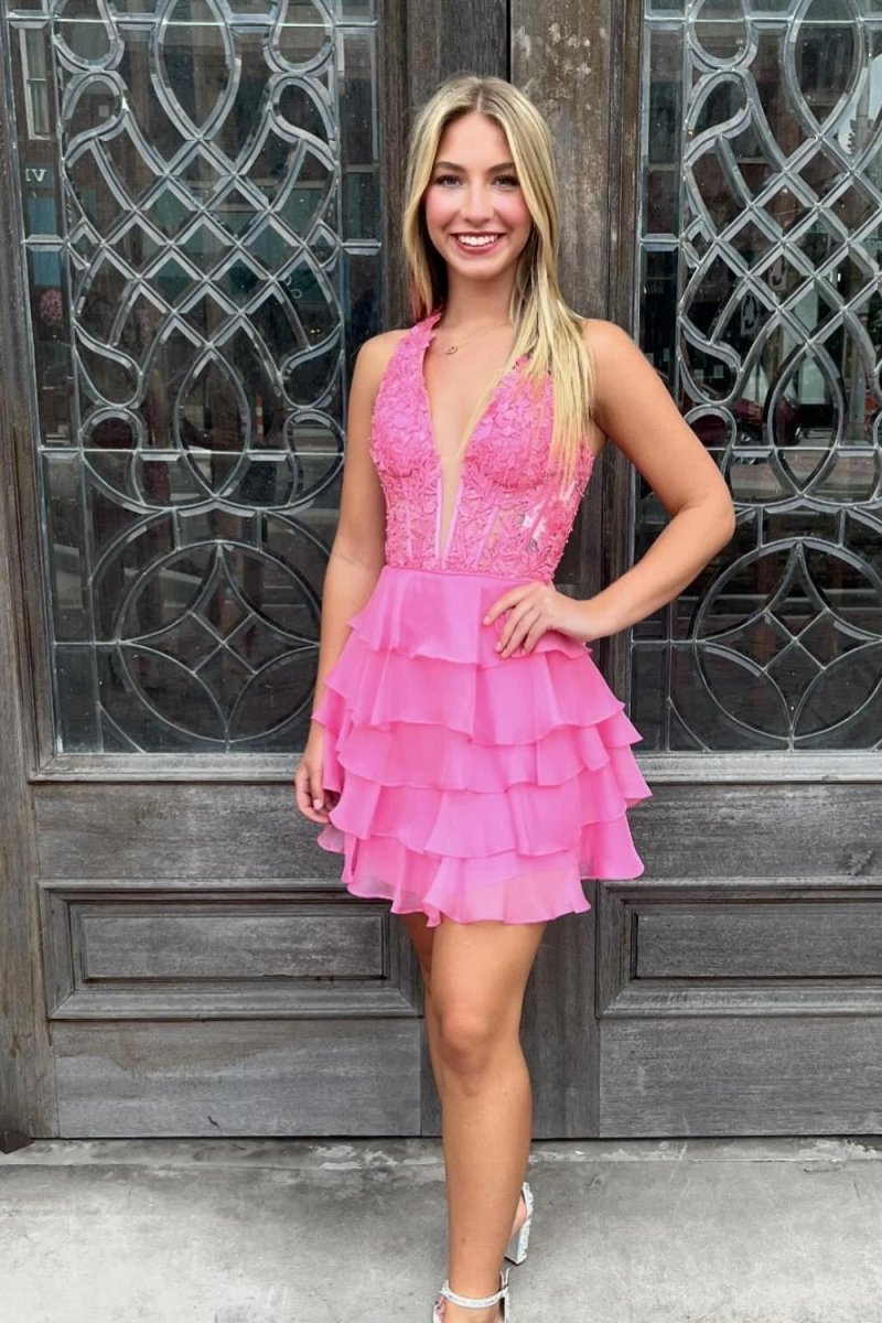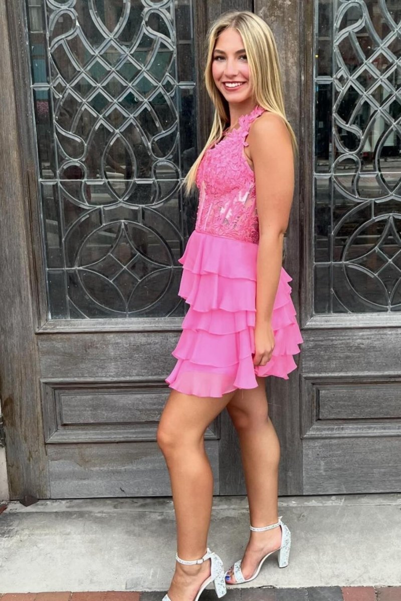 Everett | Hot Pink - Halter Lace and Chiffon Ruffle Homecoming Dress