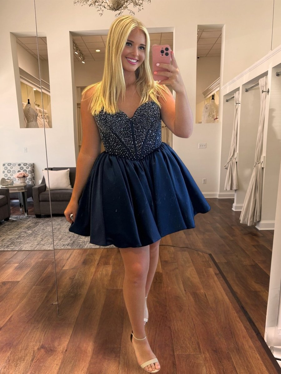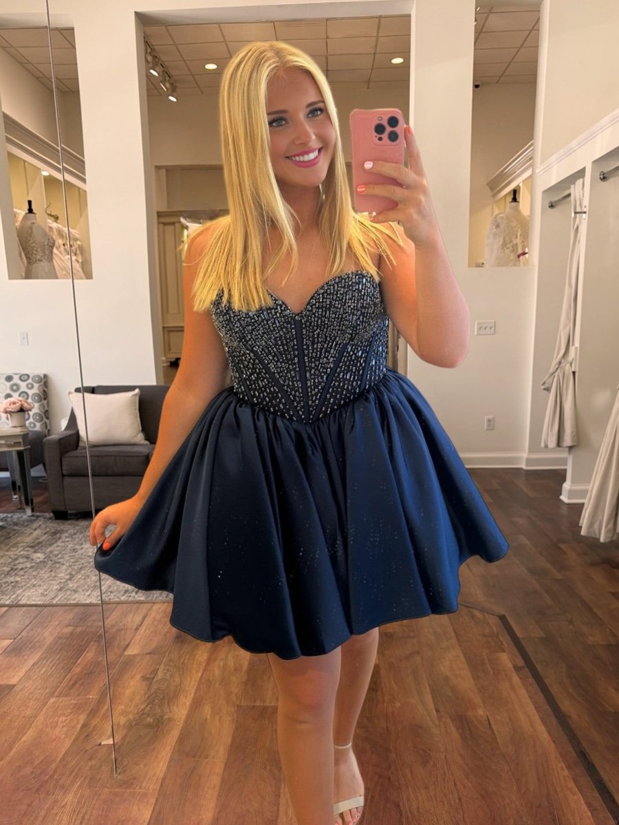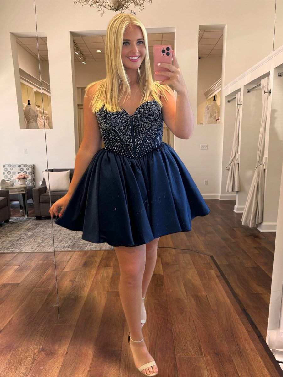 Hira | Navy Blue - Strapless Satin A Line Short Homecoming Dresses With Beading