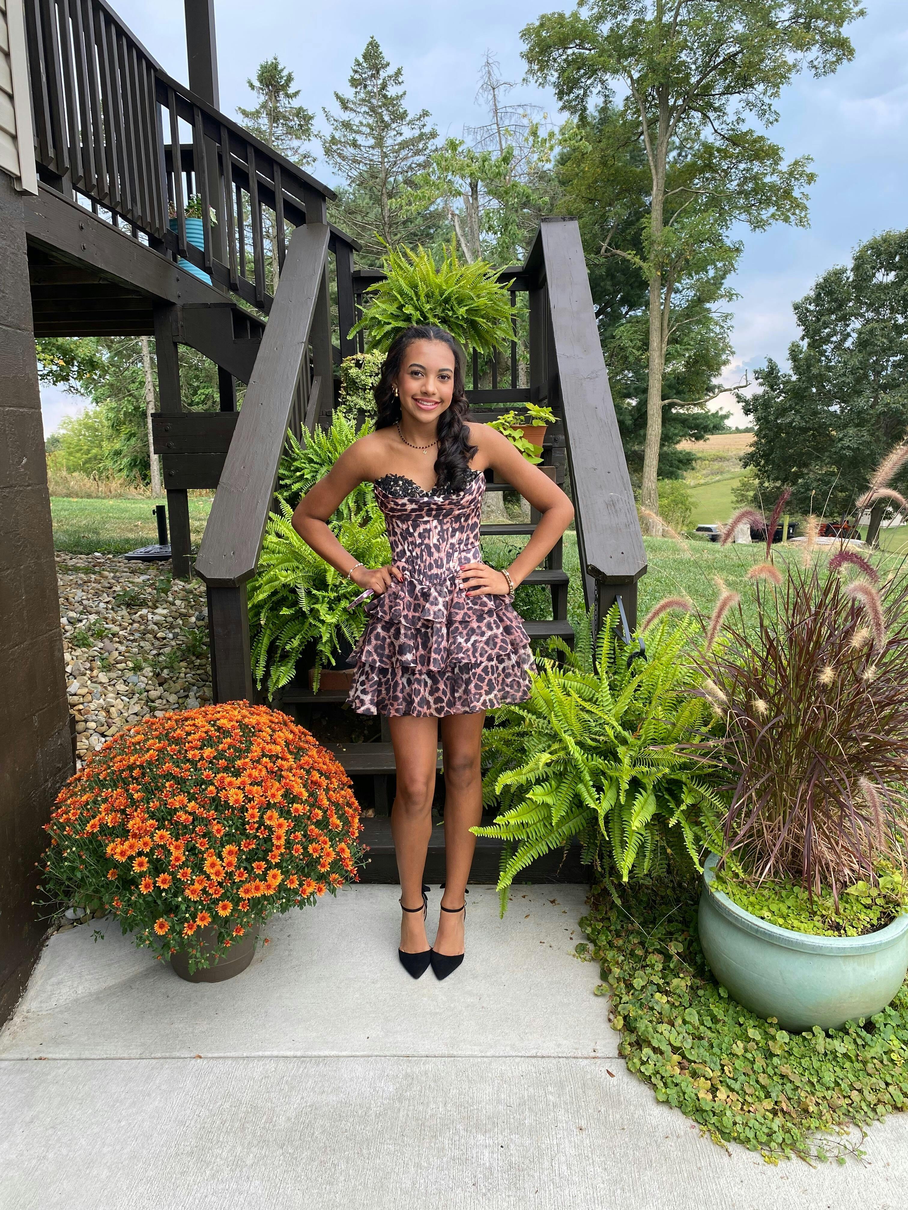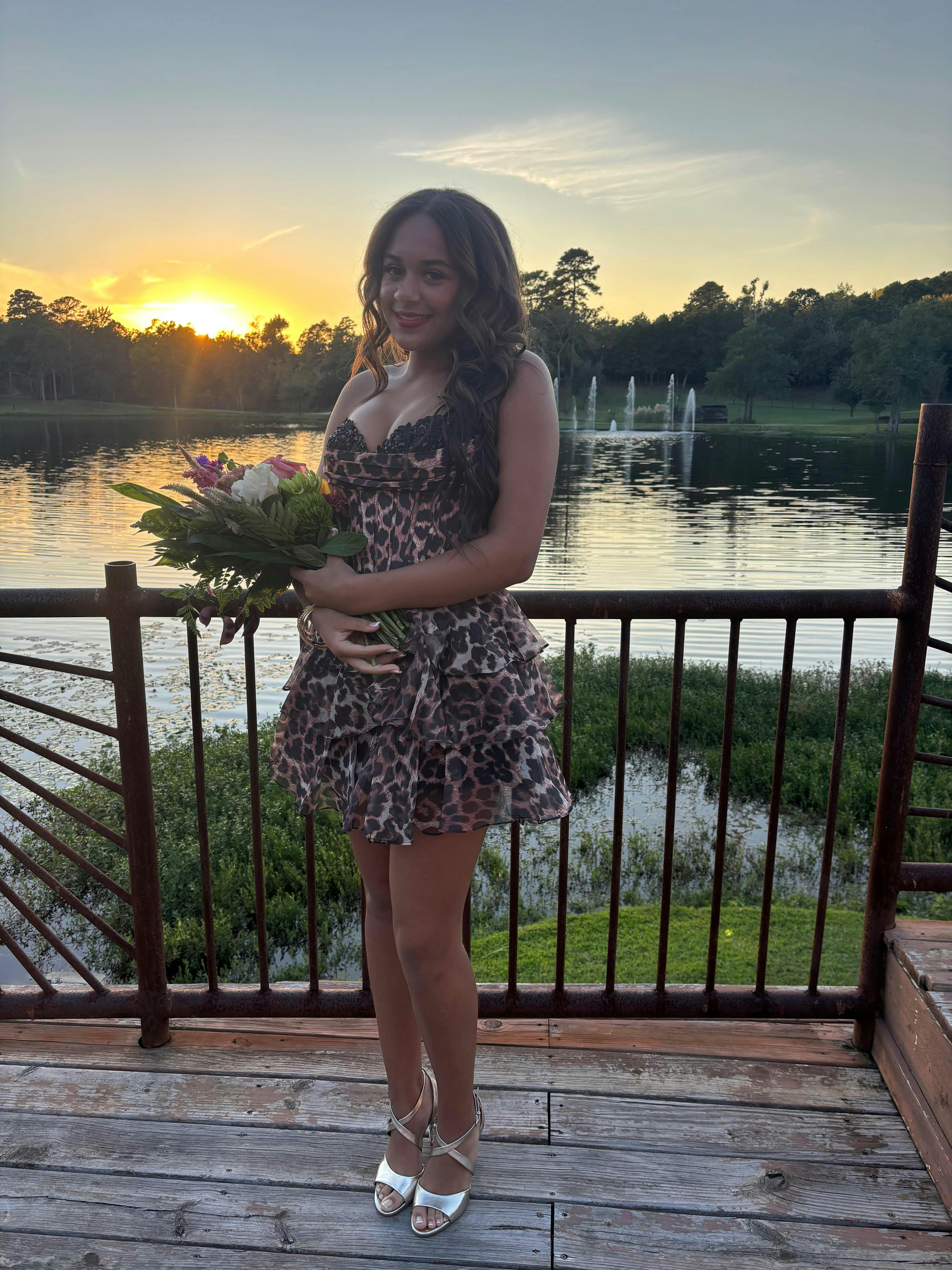 Featuring a fierce leopard print on lightweight chiffon, this strapless A-line silhouette combines wild energy with soft elegance. The sparkling beaded accents add a touch of glamor, while the lace-up back offers a flattering, adjustable fit. Whether you're heading to homecoming, a cocktail party, or a night out with friends, Idalia brings the perfect mix of attitude and charm to any occasion.