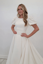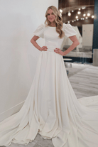 Shedestiny this ivory A-line puff sleeves satin sweeping long wedding dress is perfect for a memorable wedding. Crafted of comfortable satin, the jewel neckline and puff sleeves enhance the classic silhouette, while a sweeping train adds drama and grace. The A-line skirt flatters the figure for a timelessly beautiful look on your special day.