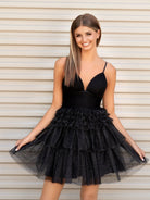 Dance the night away in Layla, our A-Line Deep V Neck Tiered Short Homecoming Dress. Its playful A-line silhouette flatters every figure, while the deep V-neckline adds a hint of allure. Designed for those who desire to make a stylish statement, this stunning dress guarantees all eyes on you. Dress Layla features the tulle fabric that sparkles in the light, enhancing your radiance. The spaghetti-strap deep V neckline complements the dress's youthful and fresh design. The tiered skirt, adorned with pleats and ruffles, adds movement, ensuring you'll turn heads as you dance.