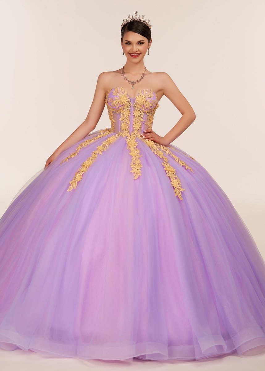 Celebrate your special day with the timeless elegance of the Lilac Sweetheart Sleeveless Quinceanera Dress. This dress is crafted from soft tulle fabric. The sweetheart neckline enhances the feminine silhouette, while the sleeveless design adds a touch of modernity. The intricate applique embellishments add a delicate, romantic flair, making this dress a true standout. The chapel-length train ensures a majestic entrance, while the lace-up back offers a customizable fit for comfort and confidence. In a soft lilac color, this dress is a stunning choice for any young woman ready to shine on her special day.