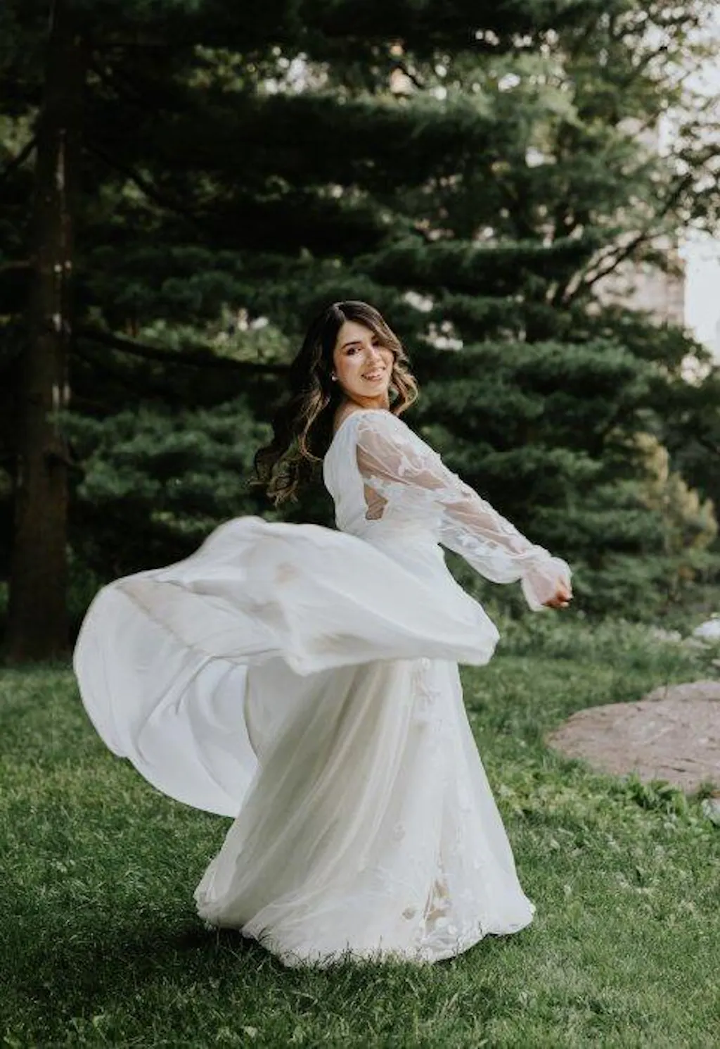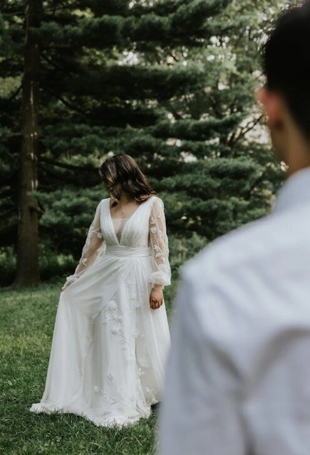 The bridal gown features a graceful V-neckline that beautifully accentuates the neckline while providing a hint of allure. Long sleeves add sophistication and elegance to the overall design, making it suitable for both spring and fall weddings. The back of the gown showcases a charming lace-up detail, allowing for an adjustable fit that ensures comfort throughout your special day.