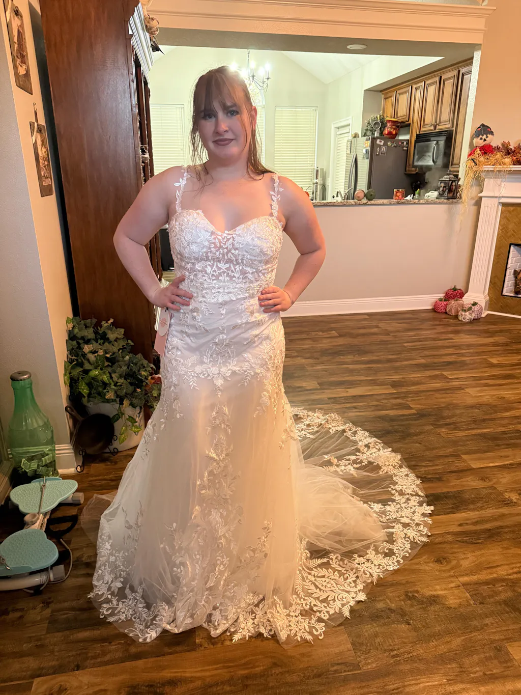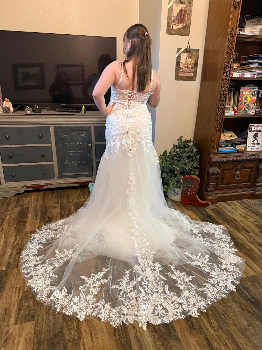 Kinslee is a romantic mermaid-style gown, crafted from tulle and lace fabric. Featuring a flattering sweetheart neckline delicate spaghetti straps that accentuate the shoulders. It boasts a sweeping train and a lace-up back for a perfect fit. Kinslee embodies elegance for your special day.