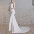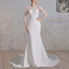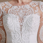 Crafted from delicate lace fabric in stunning shades of Diamond White, Champagne, and Black, this wedding dress features a figure-hugging mermaid silhouette that flows gracefully into a romantic sweep train. The soft scoop neckline and long sleeves provide a classic, refined look, while the covered button back adds vintage charm. Intricate lace appliques combined with shimmering beadings enhance the gown with texture and sparkle, making it a standout choice among sophisticated bridal gowns.