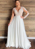 Modest Long Sleeves V-neck Lace Appliques A-Line Chiffon Beach Plus Size Wedding Dresses