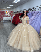Transform your quinceanera into a fairytale with this enchanting Off-The-Shoulder Butterfly Glitter Ball Gown. This dress is crafted from delicate tulle fabric, giving it an ethereal, floating effect that exudes elegance. The timeless off-the-shoulder neckline frames your shoulders gracefully, creating a soft and romantic look. The appliqued butterfly details and shimmering glitter accents add a touch of magic, making you feel like you’re stepping straight out of a dream. In a stunning off-white hue, this gown is the epitome of purity and sophistication. The lace-up back ensures a perfect fit, allowing you to move with ease while feeling secure and comfortable. This glittering butterfly-embellished ball gown is the ultimate choice for making your quinceañera a day to remember.