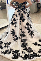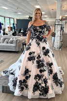 Off the Shoulder Tulle Long Wedding Dress with Black Appliques