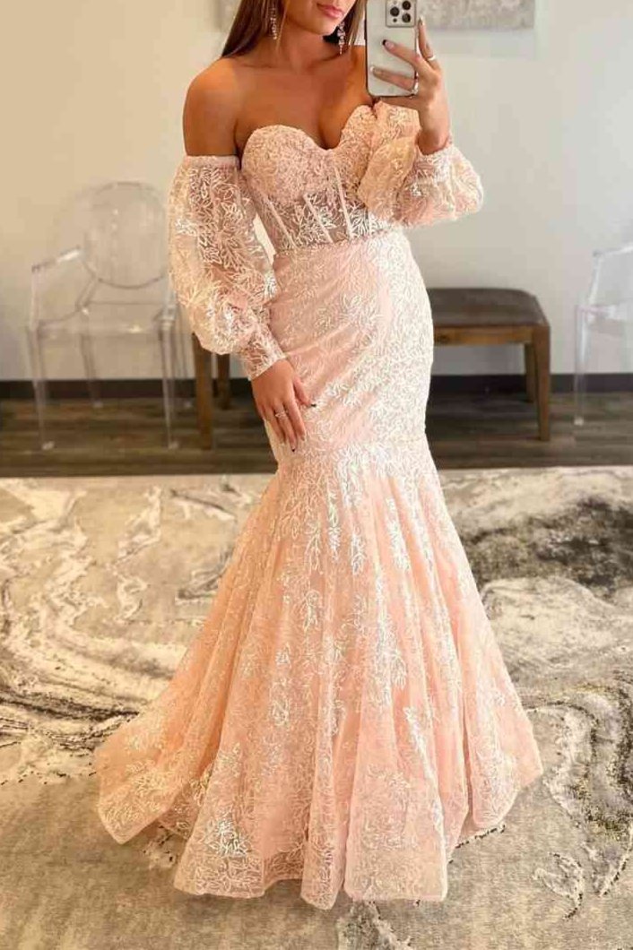 Peach Sweetheart Sheer Lace Corset Mermaid Prom Dress