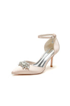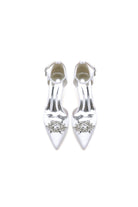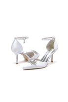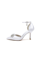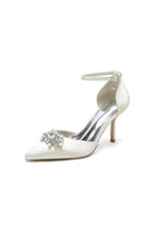 Add an elegant touch to your bridal look with White Pointed Toe heels, featuring a sparkling crystal flower embellishment. The sleek stiletto heel measures 8.5 cm for the perfect amount of height, while the one-strap buckle closure ensures a secure fit on your special day. The pointed toe design, soft imitation pigskin sole and rubber lining make these shoes comfortable and stylish for any wedding occasion.