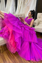 Elevate your prom night with "Giana," a dress where classic meets contemporary. Cast in a rich, royal purple, Giana's silhouette flows effortlessly in a timeless A-line style. The dress is sculpted with layers of premium tulle fabric, each tier cascading with grace and complemented by meticulously crafted pleats. The plunging V-neckline, mirrored at both the front and the back, exudes a bold femininity. This daring detail is balanced with multi-tiered ruffles, creating an ensemble that speaks volumes. An open back adds a touch of modernity, while the discreet zipper ensures a flattering fit.