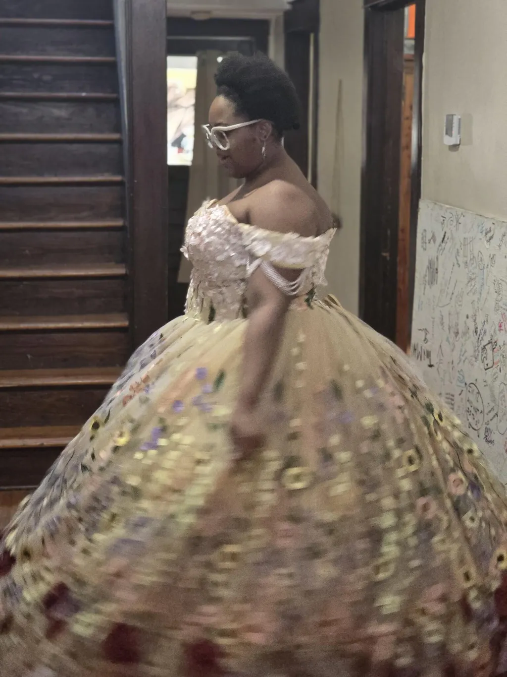 Embrace a look of pure elegance with this Quinceanera Flower Off-the-Shoulder Ball Gown Dress in enchanting champagne. This gown features an off-the-shoulder neckline that beautifully highlights the collarbone, adding a touch of romance to your Quinceanera celebration. It is made from luxurious tulle that creates a full, regal effect, perfect for making a grand entrance. The intricate floral appliques and delicate beading embellish the bodice and skirt, adding subtle sparkle and texture to the design. The sweep train flows gracefully behind, offering a timeless, dramatic touch. With a lace-up back, this gown ensures a comfortable and flattering fit. Celebrate your special day in this captivating, floral-inspired ball gown that exudes sophistication and grace.
