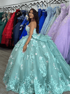 Step into the spotlight with the Sage Quinceanera Dress. This dress is crafted from layers of airy tulle and features a classic strapless neckline that beautifully frames the shoulders, while the sage color brings a soft, sophisticated elegance to your look. A sweep train flows gracefully behind, adding a touch of drama to your entrance. The lace-up back ensures a secure, flattering fit, and intricate appliques embellish the bodice and skirt, enhancing the gown's luxurious feel. Embrace your inner princess and make memories in this exquisite Quinceanera dress.