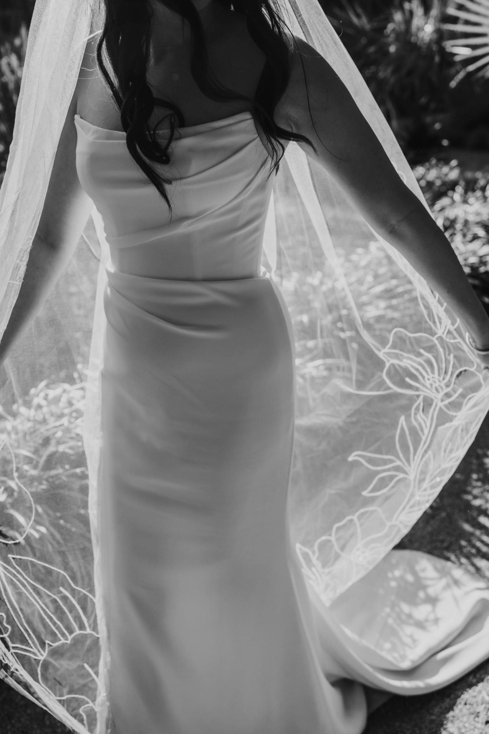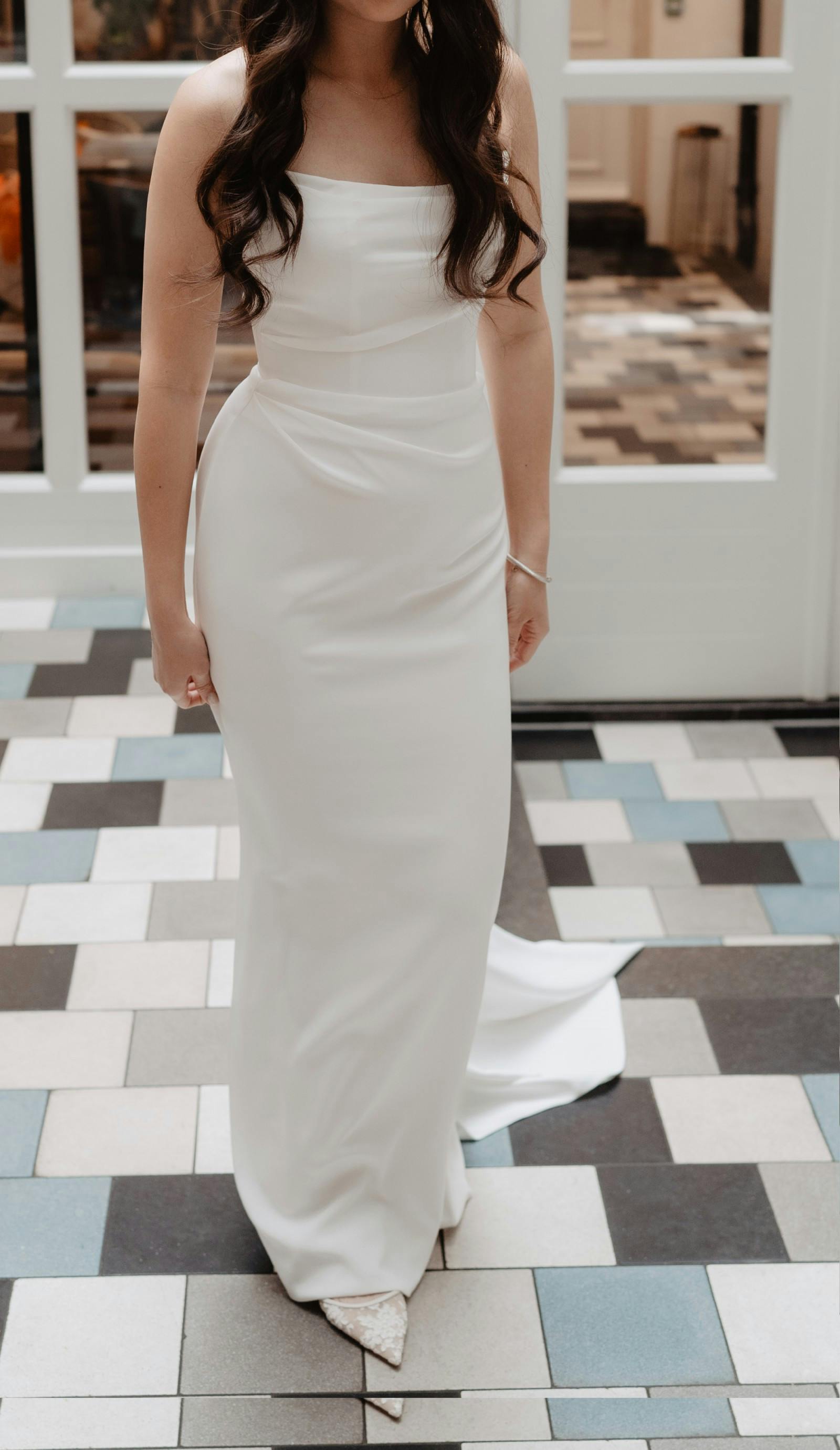 Lilia, a timeless mermaid-style wedding dress crafted from luxurious satin fabric in classic White. With a strapless neckline, sleeveless design, and sweeping train in White. Finished with a sophisticated covered-button back, Lilia embodies elegance and sophistication for your special day.