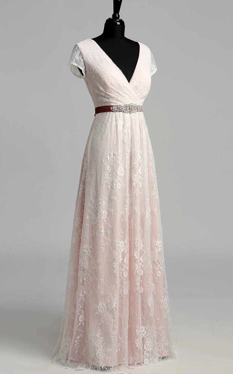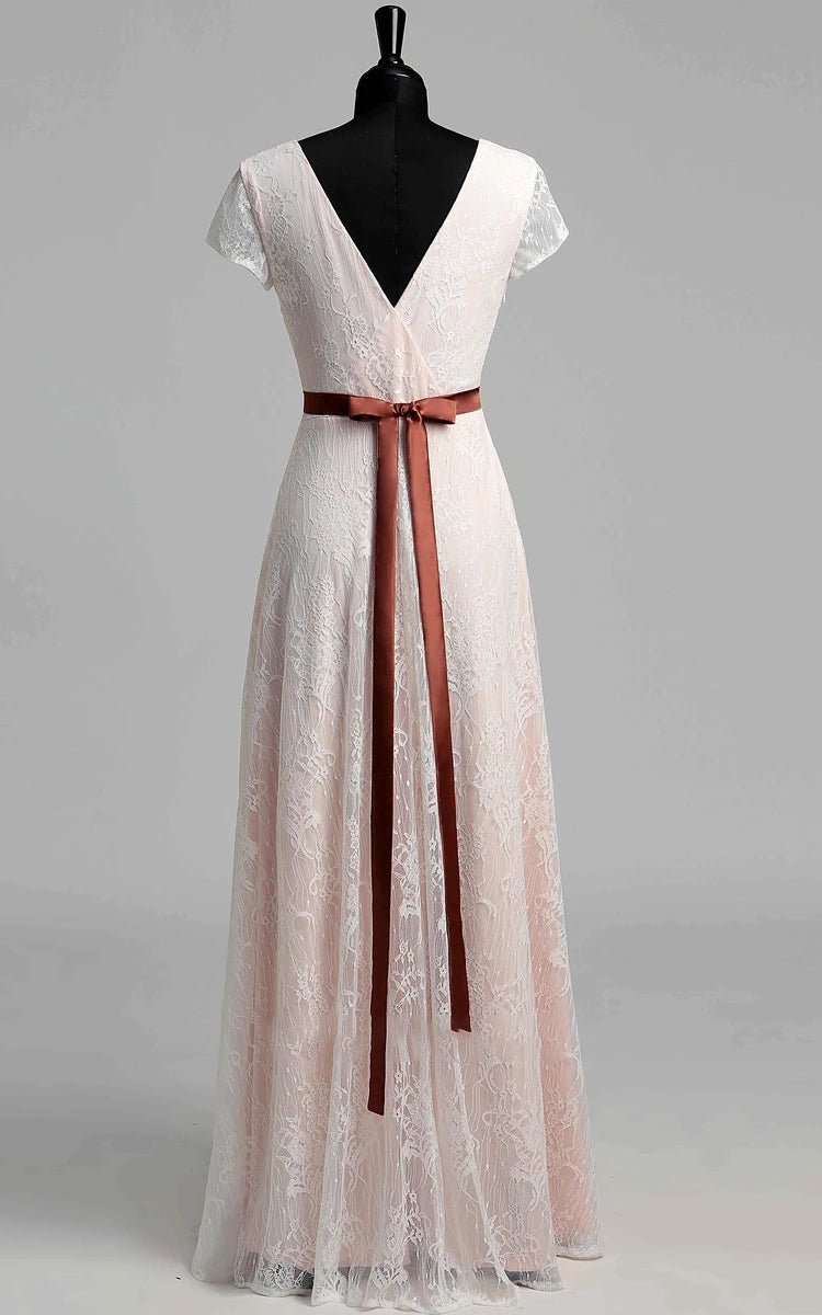 Crafted from elegant lace fabric in Diamond White and White-Nude, the graceful A-line wedding dress flatters every figure and flows into a soft sweep train for a touch of drama. The gently pleated bodice with a flattering V-neckline and charming short sleeves offers modest elegance, while the clean zipper-up back ensures a comfortable fit. This gown is a graceful choice among refined bridal gowns, perfect for garden ceremonies, church weddings, or vintage-inspired celebrations.