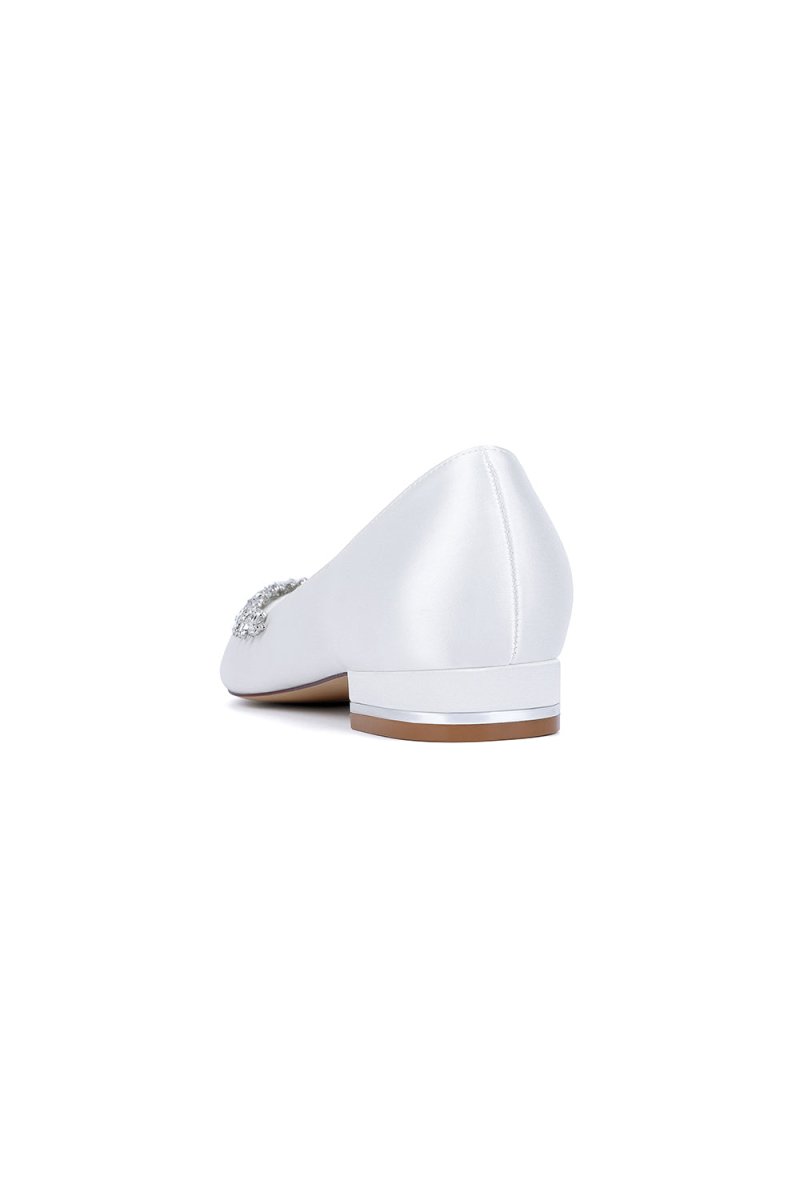 Embody splendor and refinement with these beautiful white satin high heels. Meticulously crafted with a pointed-toe silhouette, these shoes boast a lustrous satin upper that exudes purity and sophistication. The heel is both chic and modest, with a sculpted cut-out detail that adds a contemporary twist. Its natural brown hue beautifully contrasts the white satin, resulting in a captivating aesthetic. But perhaps the most stunning feature is the elaborate array of crystal embellishments adorning the vamp. Each crystal is strategically placed in an intricate arrangement, with a focal point of a larger, heart-shaped piece. This dazzling pattern infuses a touch of opulence and grandeur, making these heels a coveted accessory for formal events or special occasions. All in all, these white satin high heels with crystal embellishments epitomize elegance and class. With their sleek design and impeccable craftsmanship, they are an essential addition to any fashionista's wardrobe.