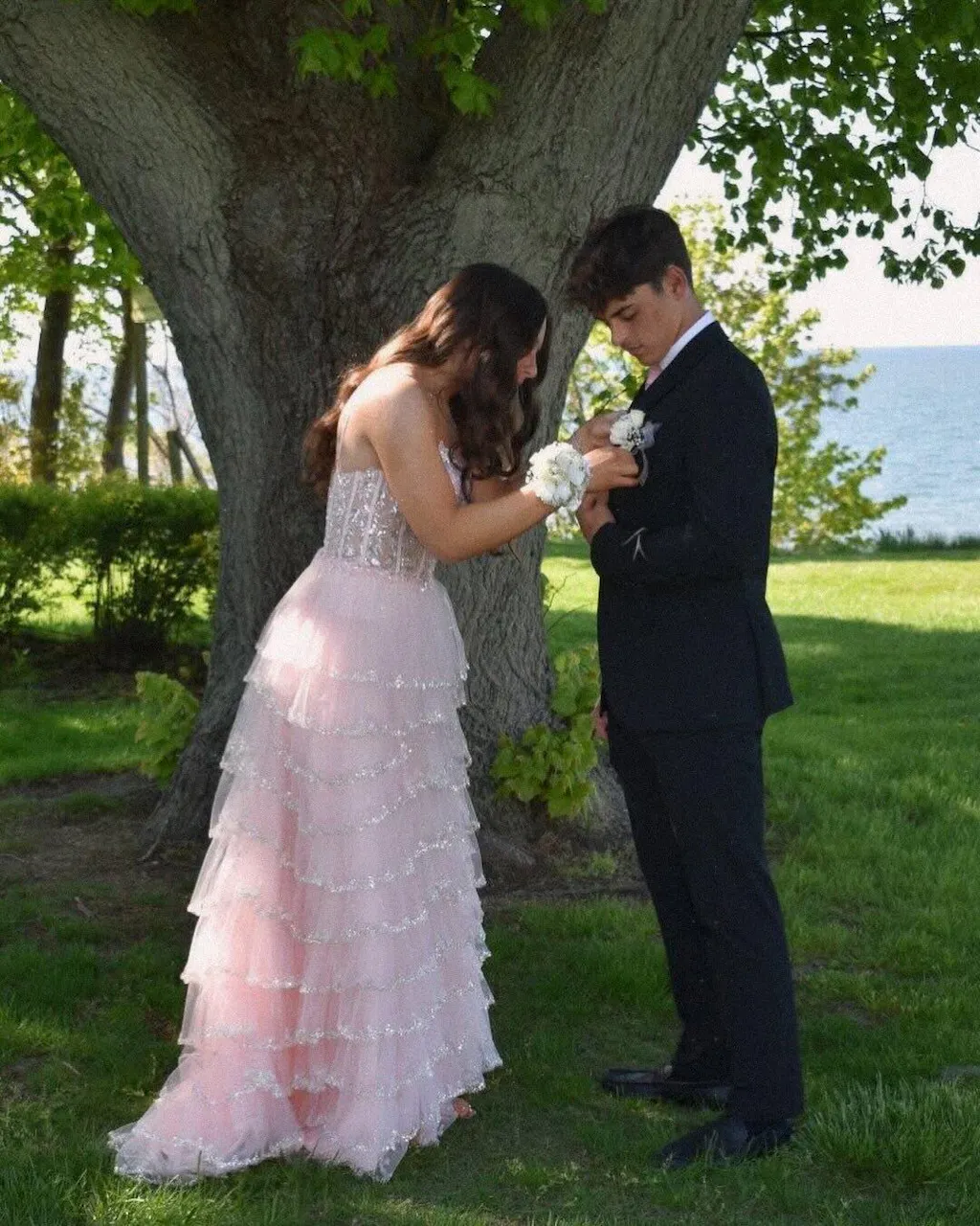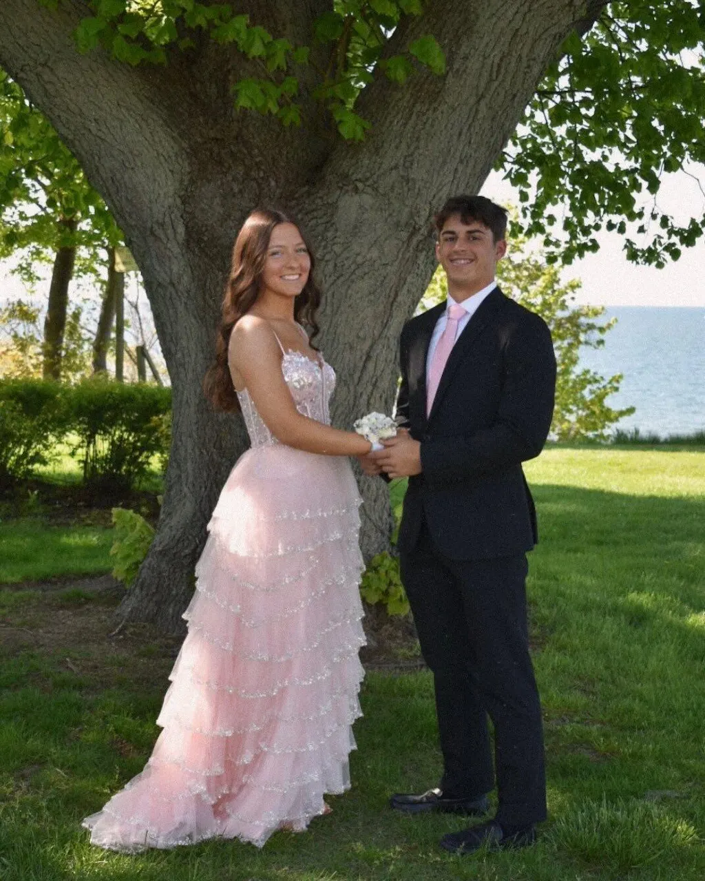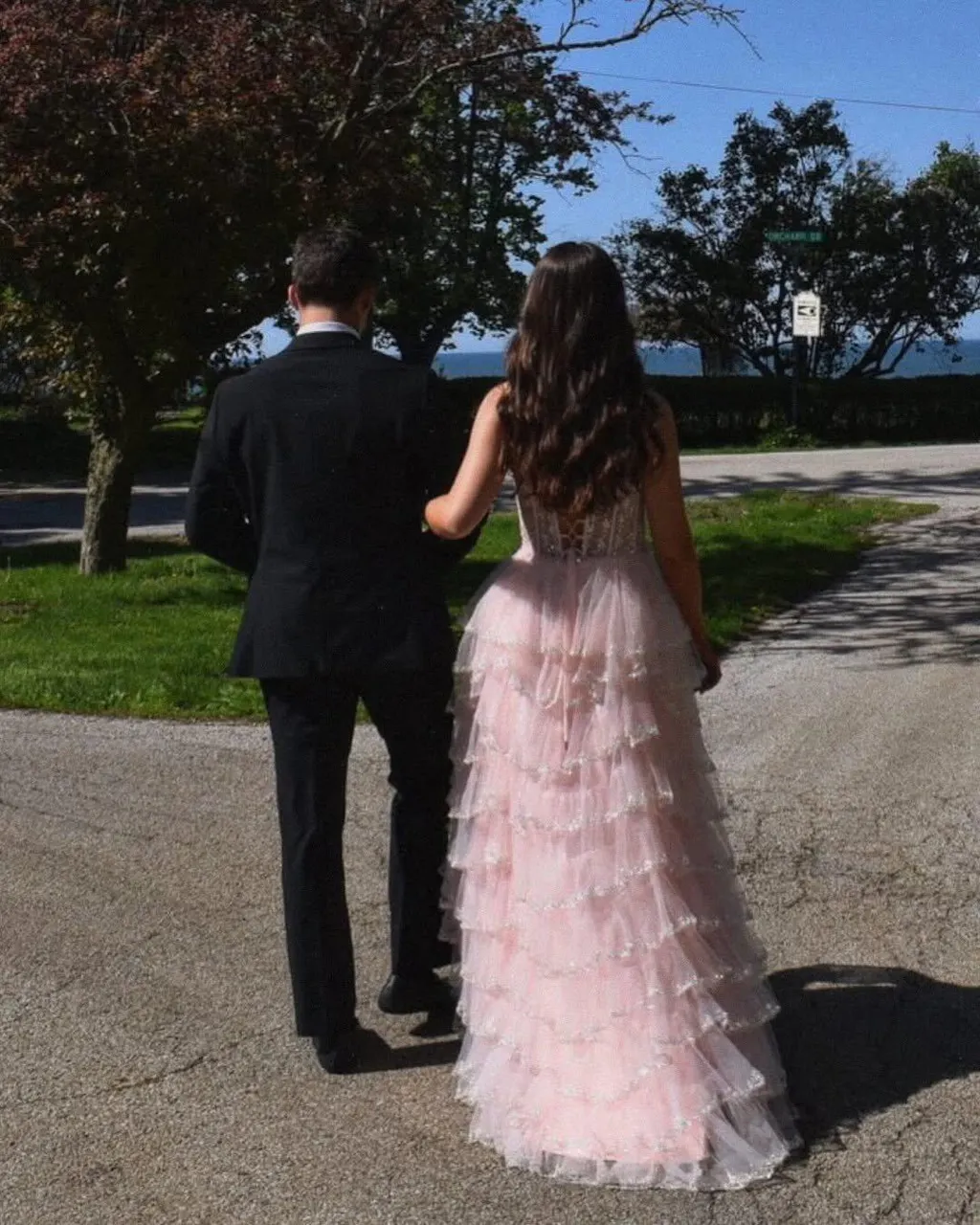 Step into the spotlight with the stunning Abbie Straps Black Mesh Cutout Sequined Layered Long Prom Dress. This captivating A-Line dress is crafted from luxurious tulle that flows effortlessly, creating a mesmerizing sweep train that adds drama to your every step. It is available in a variety of stunning colors. The spaghetti straps provide a delicate touch, while the illusion corset bodice showcases your shape with its intricate cutout design. This dress is a perfect choice for both evening dresses and formal dresses, adorned with its sequins that catch the light, adding a touch of glamour, and the layered ruffles bring movement and texture to the overall look. A daring slit enhances the dress’s allure, making it perfect for making an unforgettable entrance. Whether it's prom, a gala, or a special celebration, the Abbie dress will have you feeling glamorous and ready to shine.