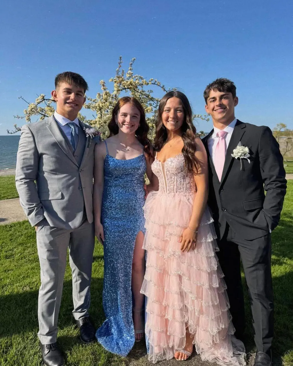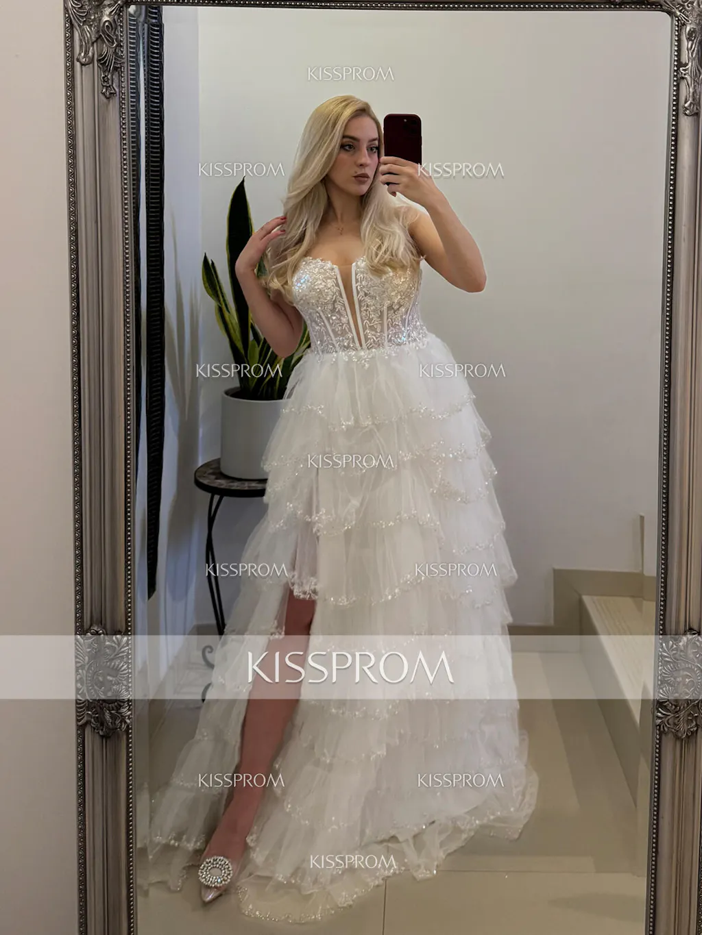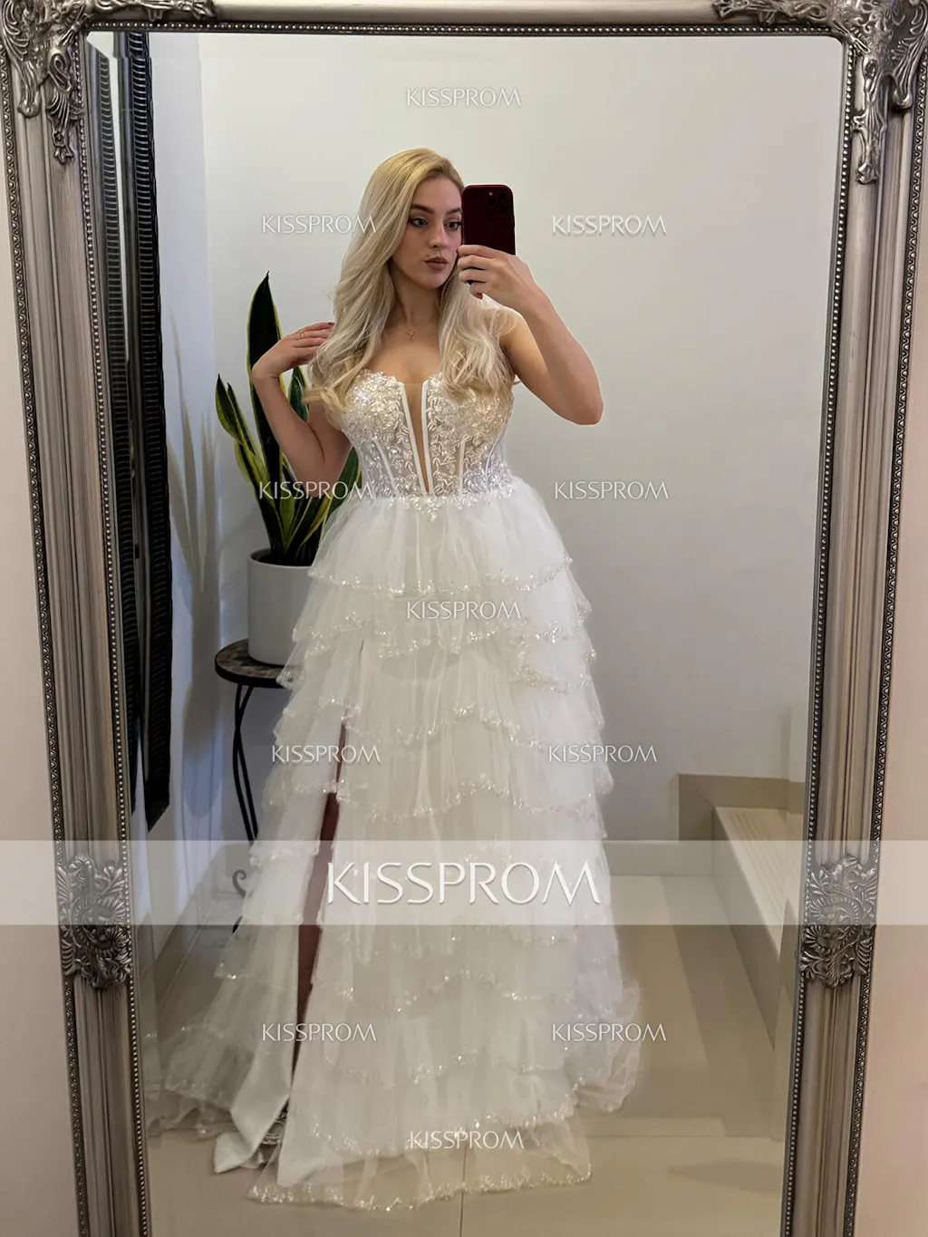Step into the spotlight with the stunning Abbie Straps Black Mesh Cutout Sequined Layered Long Prom Dress. This captivating A-Line dress is crafted from luxurious tulle that flows effortlessly, creating a mesmerizing sweep train that adds drama to your every step. It is available in a variety of stunning colors. The spaghetti straps provide a delicate touch, while the illusion corset bodice showcases your shape with its intricate cutout design. This dress is a perfect choice for both evening dresses and formal dresses, adorned with its sequins that catch the light, adding a touch of glamour, and the layered ruffles bring movement and texture to the overall look. A daring slit enhances the dress’s allure, making it perfect for making an unforgettable entrance. Whether it's prom, a gala, or a special celebration, the Abbie dress will have you feeling glamorous and ready to shine.