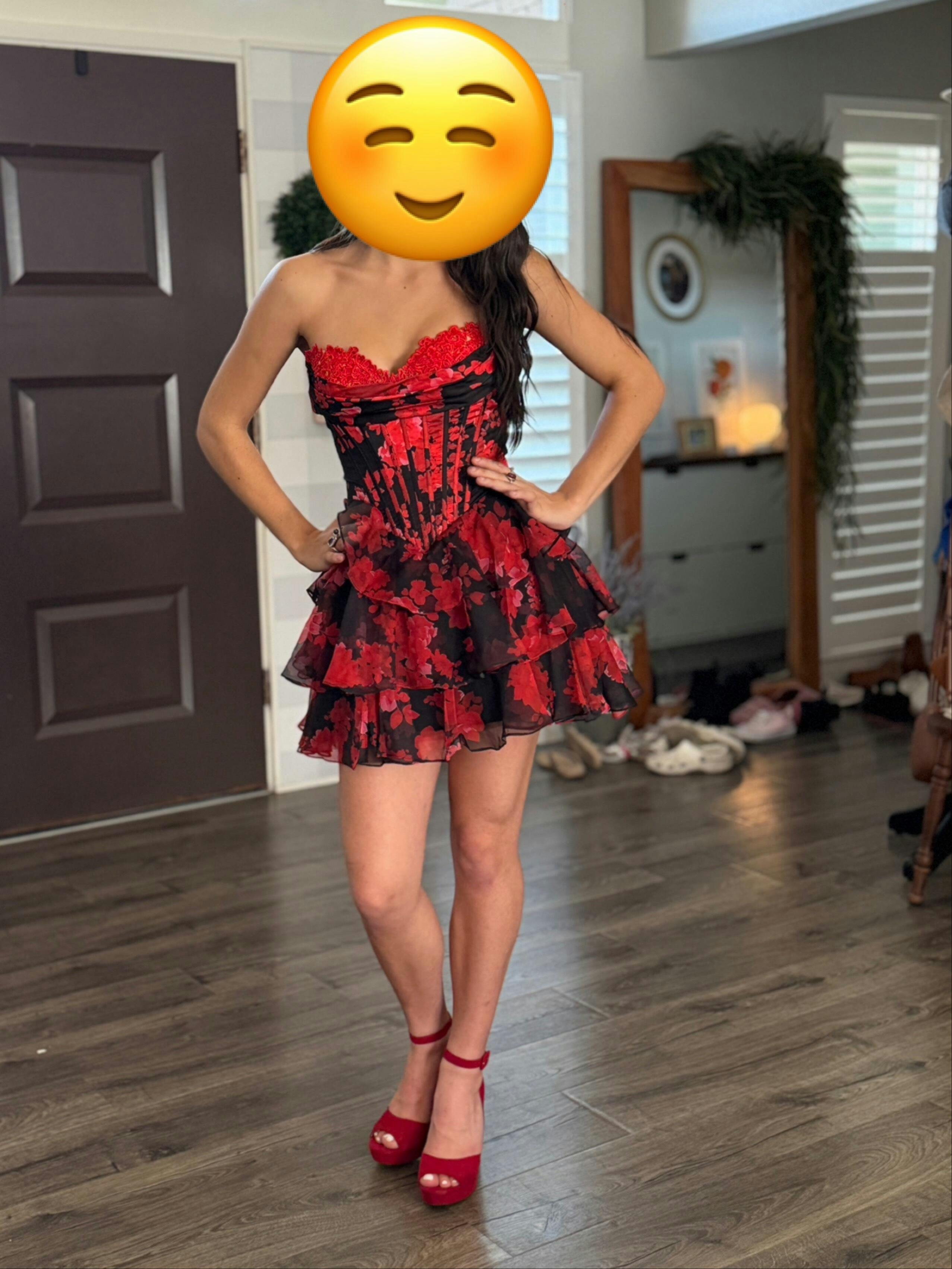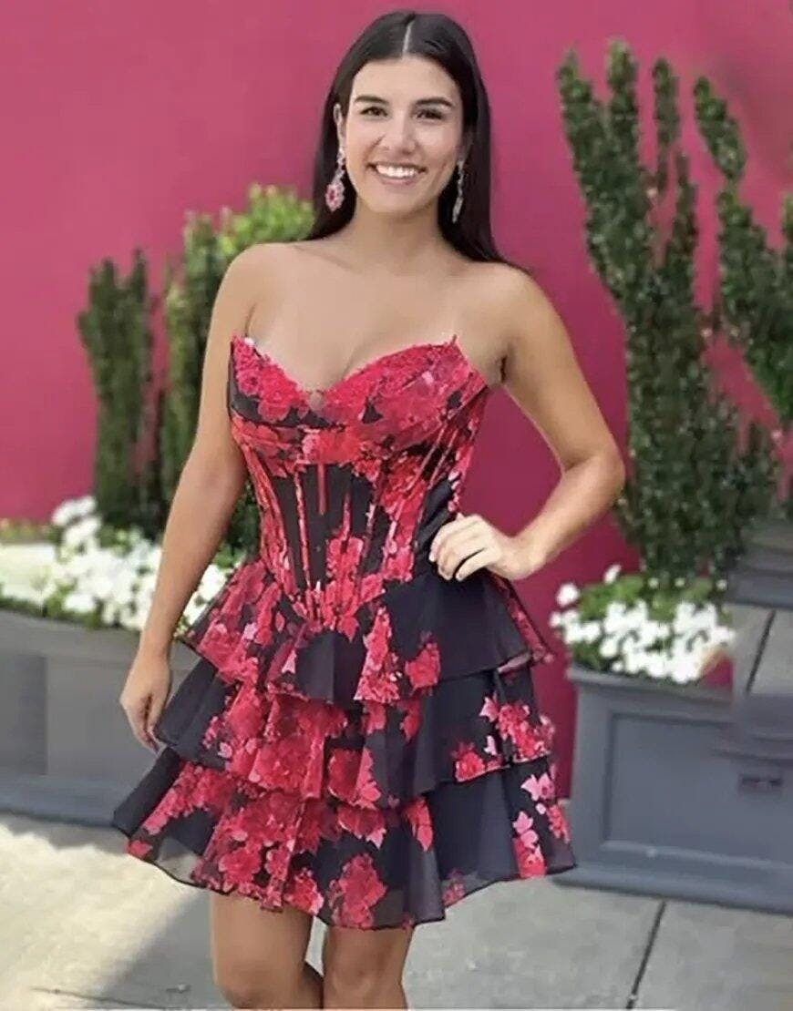 Tirzah | Red - Strapless Floral Chiffon A Line Corset Tiered Homecoming Dress With Appliques