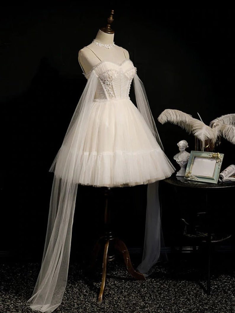 Lose yourself in the enchanting allure of our Tulle Lace Appliques Spaghetti-Straps Short Prom/Homecoming Dresses from KissProm. Hand-embellished with intricate lace appliques, each dress exudes an air of timeless sophistication, capturing the essence of youthful elegance. The delicate spaghetti straps frame your decolletage, while the off-the-shoulder sleeves and the tulle bow in the back add a touch of ethereal romance. Whether you're making an entrance at prom or celebrating homecoming, this dress ensures you'll be the belle of the ball.