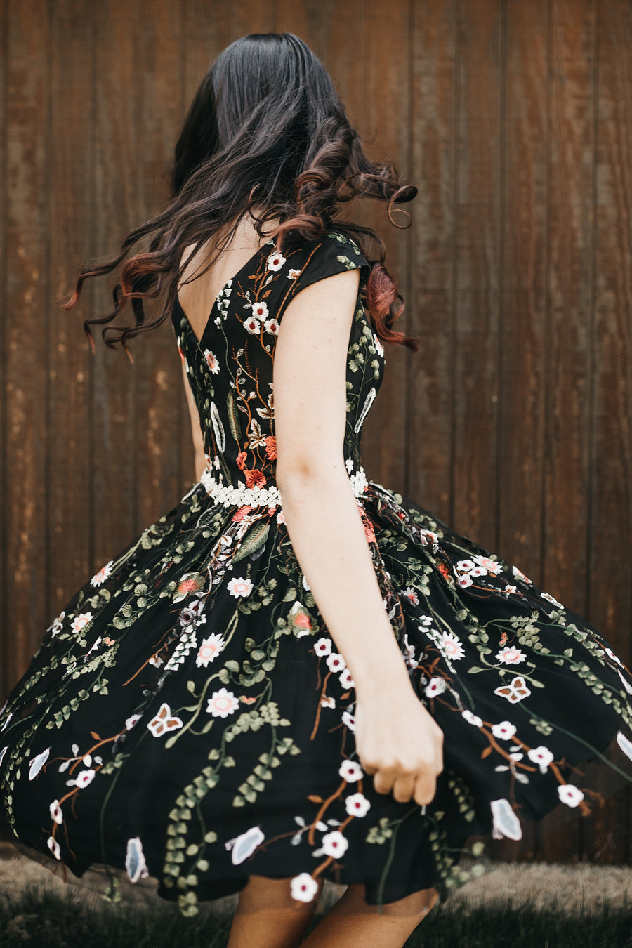 V-Neck Floral Black Homecoming Dress with Beaded Waist
