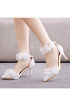 Add a touch of sweetness to your wedding look with these White Flowers Pointed Toe Ankle Strap High Heels. Featuring delicate flower embellishments and a sleek pointed toe, these stiletto heels are designed to elevate your bridal style. The one-strap buckle closure ensures a secure fit, while the rubber sole provides comfort throughout the day. Available in three heel heights, these heels are perfect for creating a stunning look on your special day.