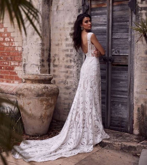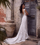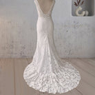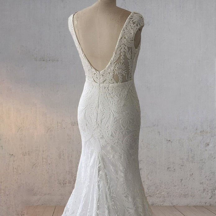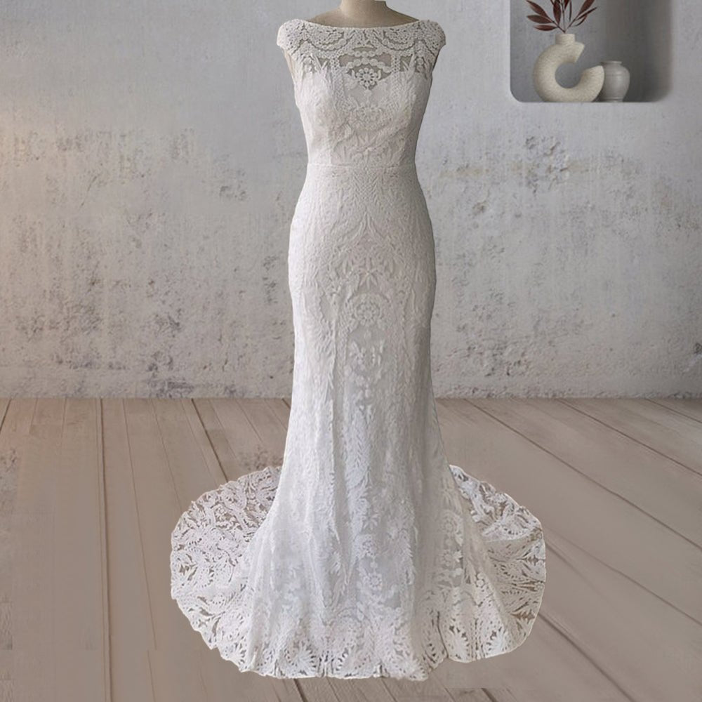 Graceful and sophisticated, this mermaid-style lace gown in classic white is perfect for a romantic bridal look. The scoop neckline and sleeveless design create a sleek, flattering silhouette, while lace appliqués add intricate texture and refined charm. Its sweep train drapes elegantly as you walk down the aisle, and the zipper back ensures a comfortable fit. A stunning and memorable choice for your wedding day.