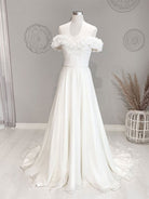 White Off Shoulder Flowers Long Beach Wedding Dress